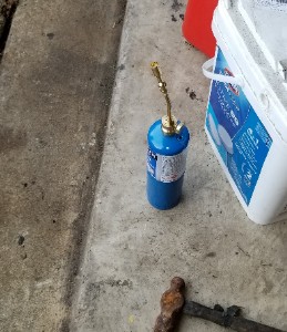 | So the "beat the header with a hammer" plan wasn't working so well... but I have a torch. It's about a 25 year old Bernz-o-matic but it counts. With some heat I started making some progress, right until the point where a leaky valve made the top of my torch into a rocket nozzle (not pictured). Once I extinguished the flaming bottle of death, I'd made it to here. | ![]() |