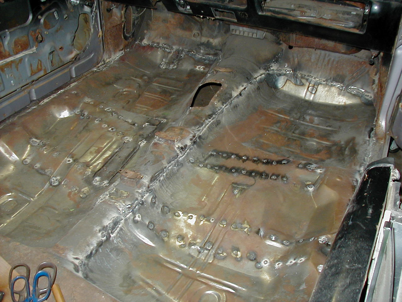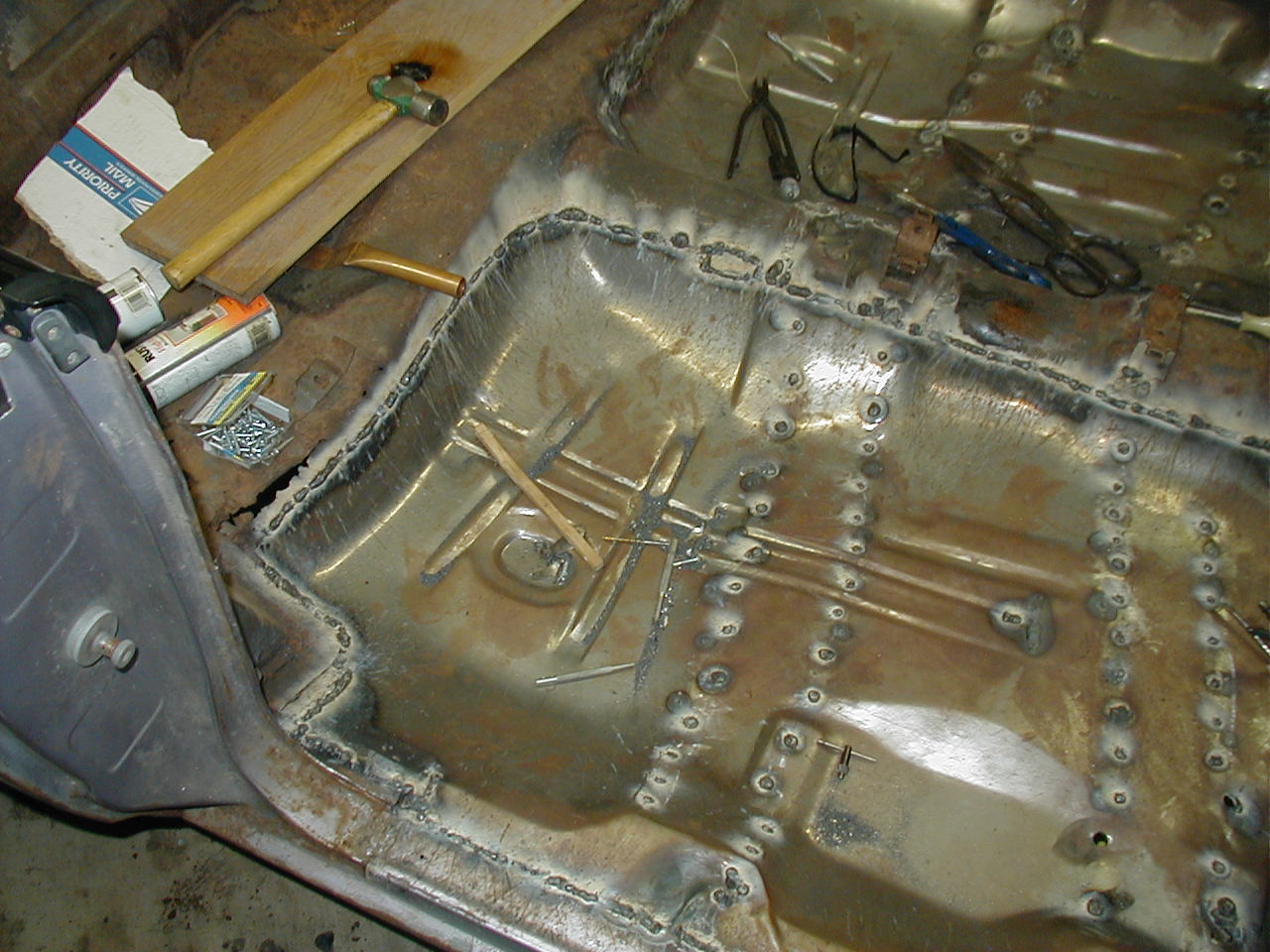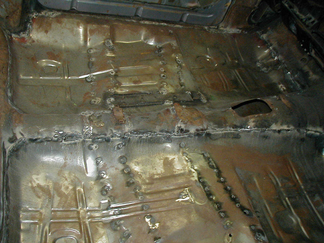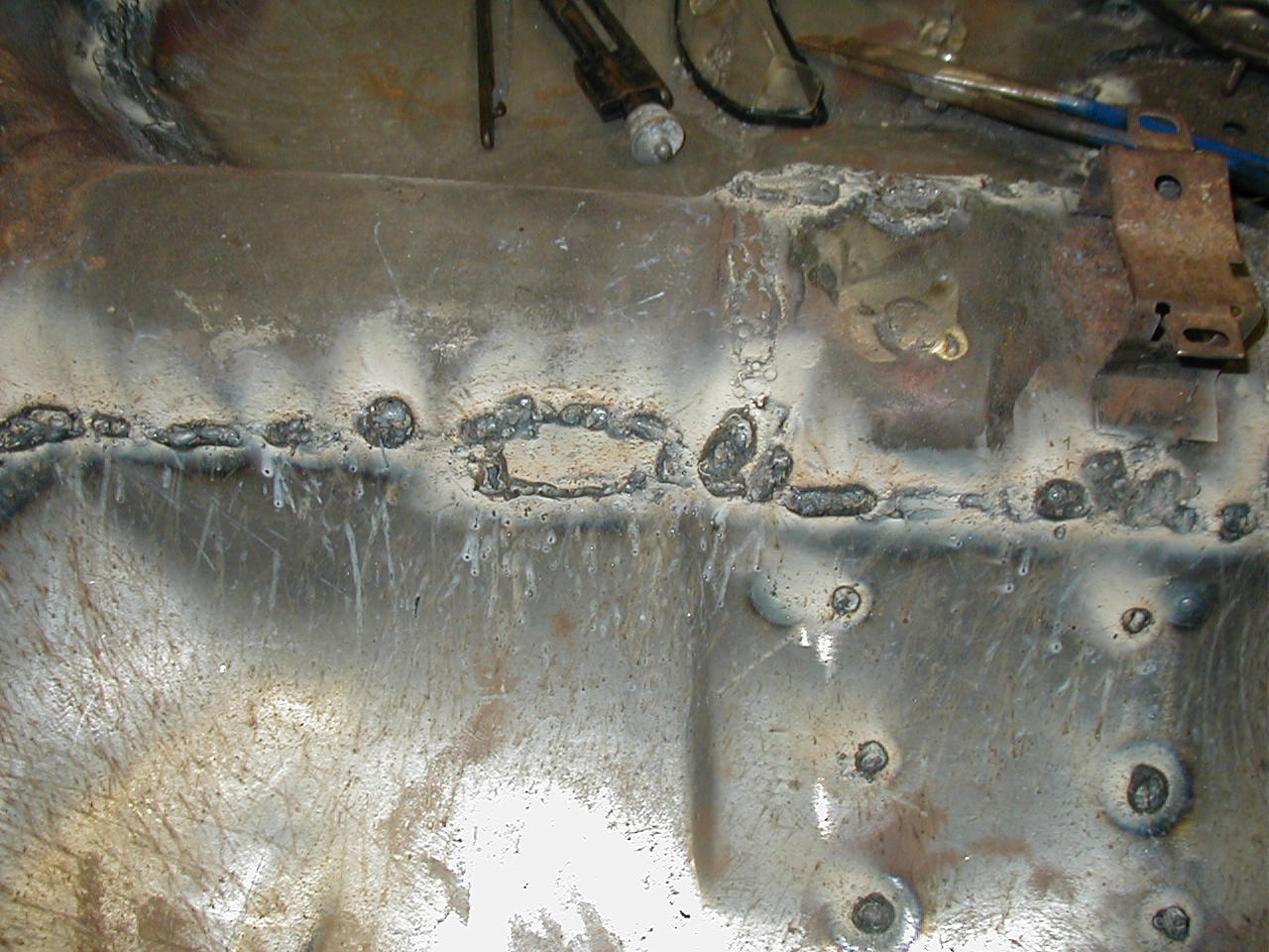 | Welded up almost all of the plug-welds, welded most of the perimeter. You can see some discoloration where I used the torch to get the old pan overlap to fit a little tighter. |
