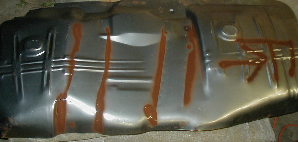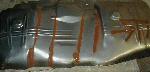 I testfit the pan again, and used spray paint to mark where the braces were. In this pic, I've already dimpled the points where the spot welds should be drilled.