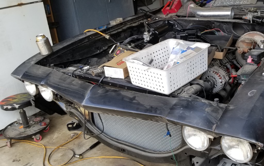 I put the header panel on. It fit, mostly, but the car is slightly too