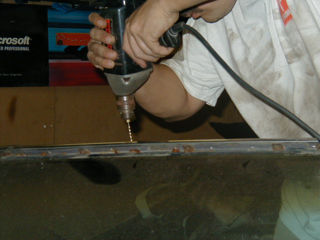 | All the screws that were holding the upper trim on were rusted out and I couldn't get a grip on them with a screwdriver. I got a set of screw extractors to remove them, here's me drilling a small hole to start with. |