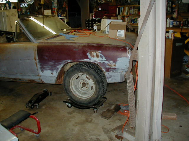 | We replaced the flat tire in the front with a spare that was sitting around the garage, just to lift that corner of the car. Interestingly enough, there's no drum and no brake hardware on this wheel, and only three studs. Doesn't really matter, since it's going B-body conversion. |