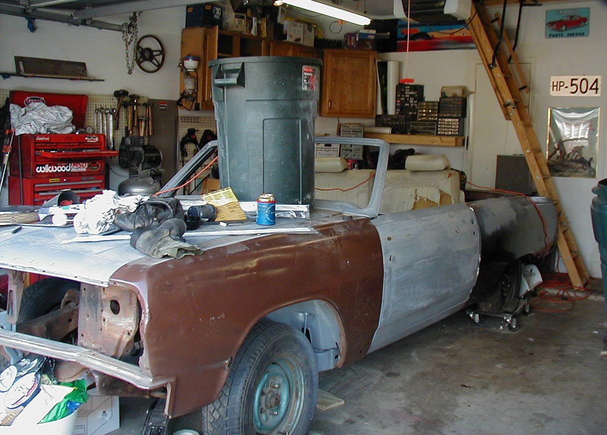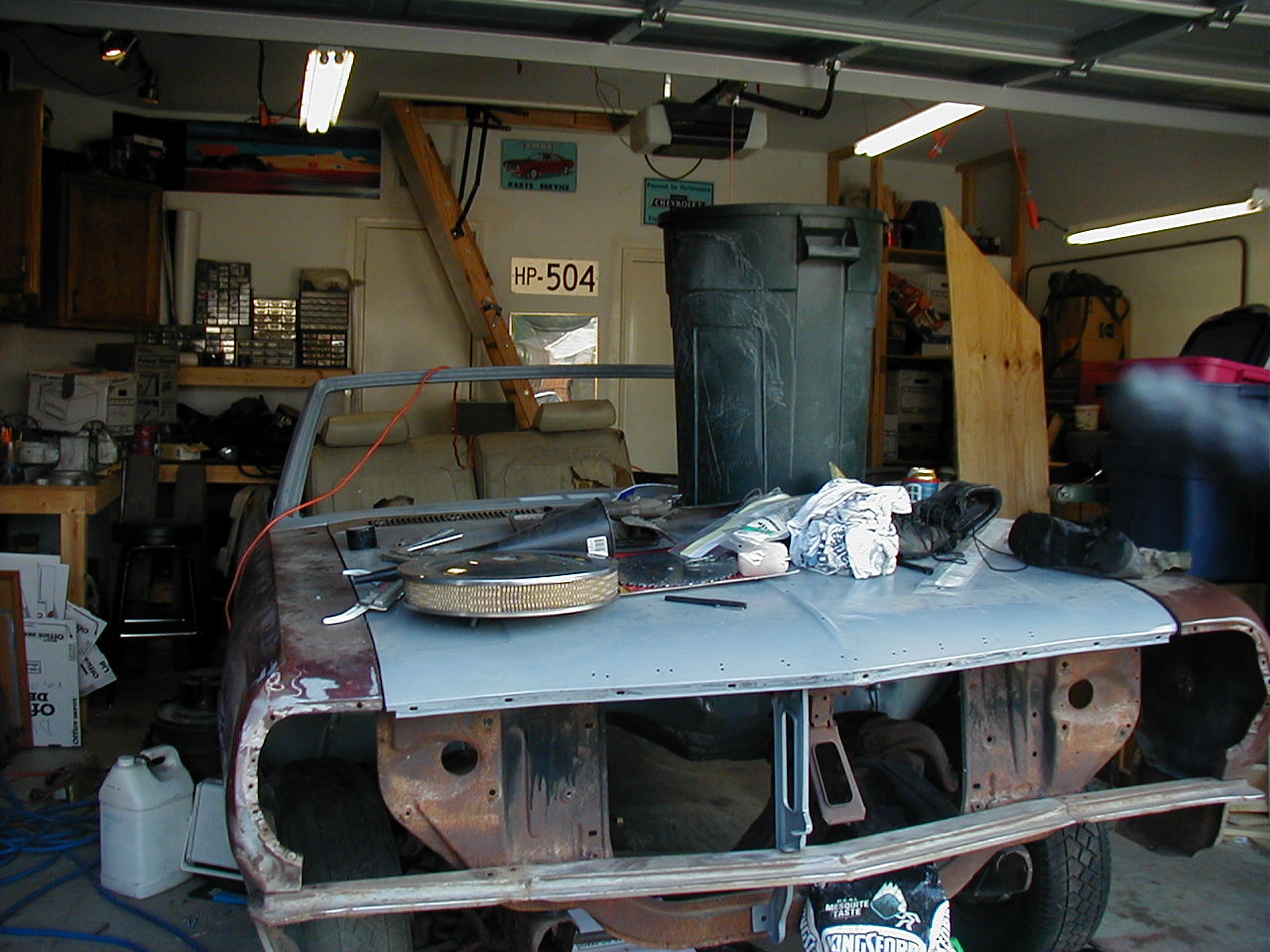 | Here's where I called it a day. The hood is cleared off; the interior is more empty than it was, and I've emptied a couple more boxes. Hopefully everyone will be able to resist the temptation to use the 'velle's hood as a workbench. I don't think I'm going to be able to get it up the attic stairs. The fenders should fit though, and the inner fenders and bumpers are already up there. |