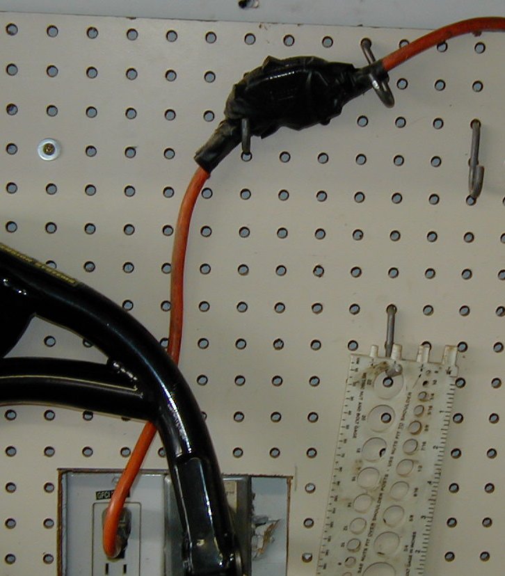 | This is kinda scary. The flourescent lights on the ceiling are all run through this switched extension cord that is just plugged into an outlet. |