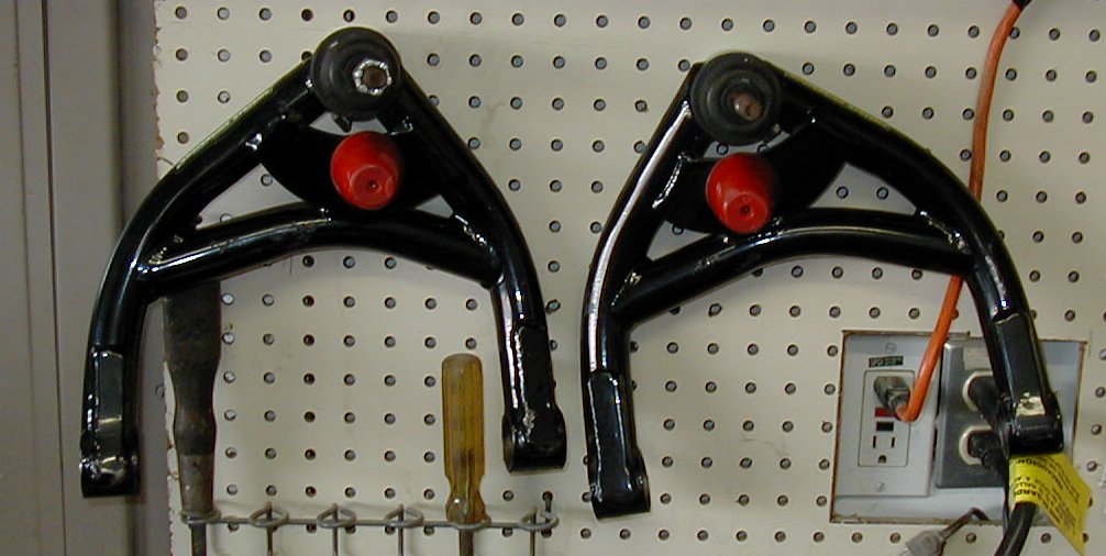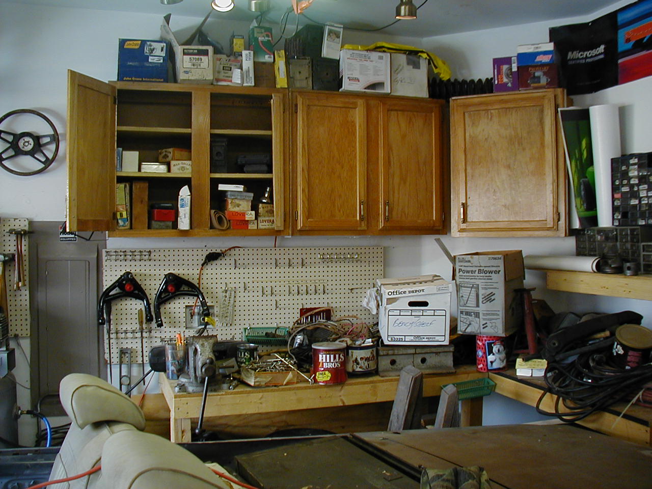 | My mother-in-law supplied the hanging cabinets. These are great - I've got parts storage on top, plus room for whatever inside. I'm not sure what I'm going to put in them, but I do not doubt that something will appear. The only definite I've got so far is one has all the carbs I had sitting around, and one has the buffer and buffing compunds, but they aren't full and contents can change. I do think I'm going to have room for 2 more on the other side of the garage once I get to that point. |