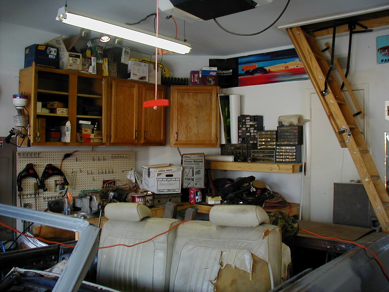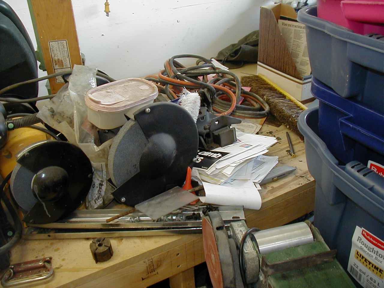 | Here's where I sat not too long after starting the evening's work. The previous owner left three workbenches - two on the wall on the left of this pic; one wide one on the wall you can't see. Immediately one of the three had to go - it was where the toolbox is now, and wasn't as sturdy as the other two. |