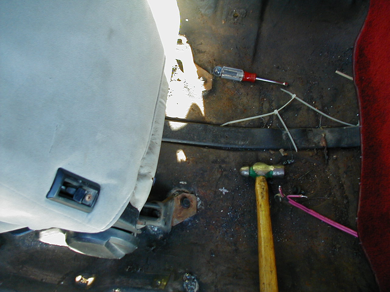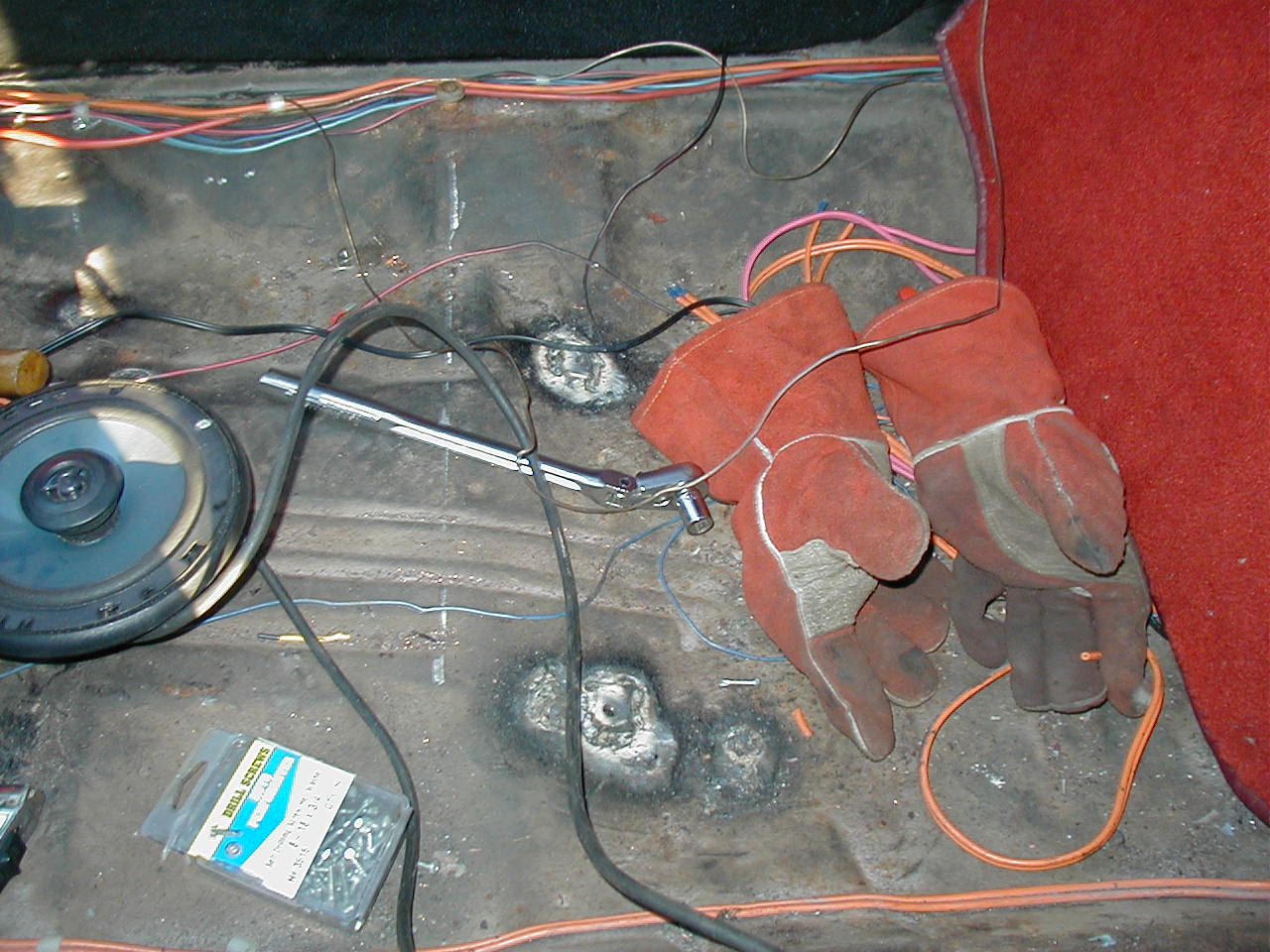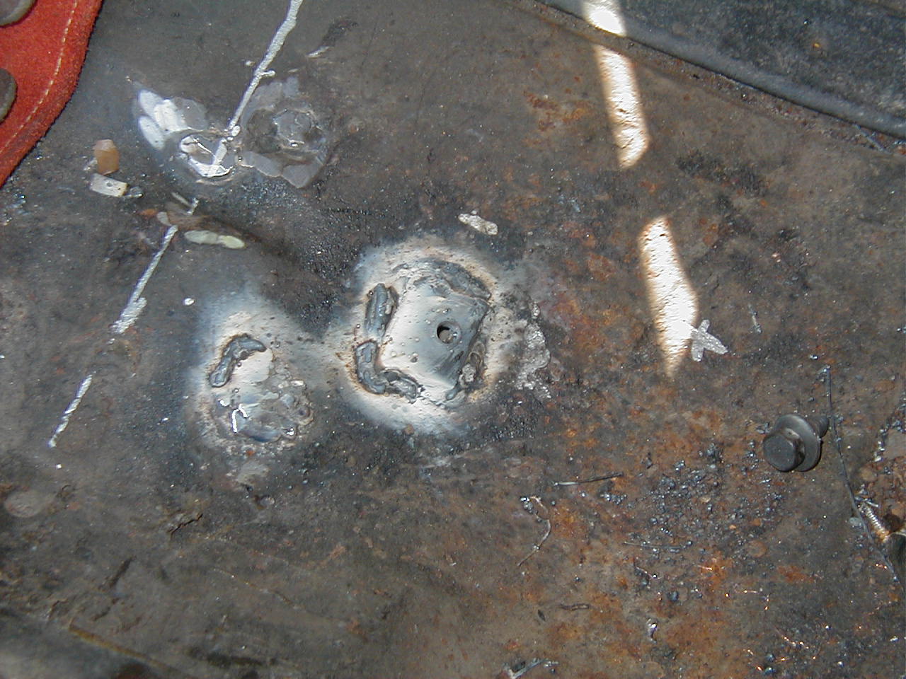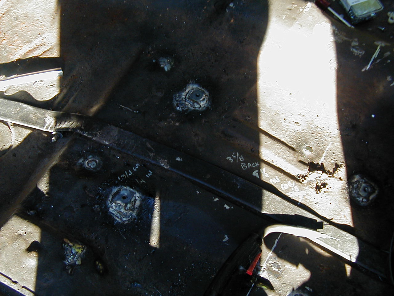 | The front two, complete with shadow! I wrote the measurements on the floor with a silver paint marker. They're measured relative to a string stretched between the outer seatbelt mounts. Lateral measurements are measured from where the floorpan meets the seam at the rocker. |